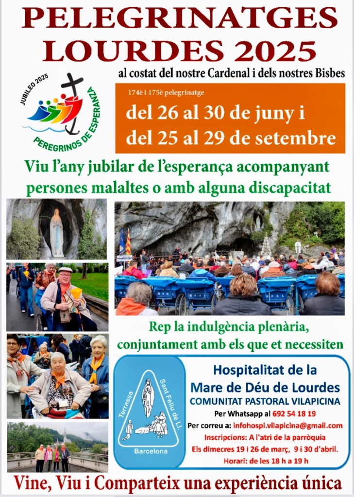 Els dies del 26 al 30 de juny, i del 25 al 29 de setembre d’enguany, la nostra Comunitat Pastoral (Santa Eulàlia de Vilapicina, Mare de Déu de Fàtima, Sant Pius Xè. i Sant Esteve) anem tots junts amb la Hospitalitat i els nostres bisbes a Lourdes (França).