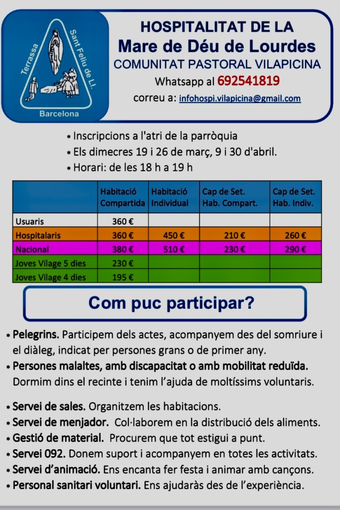 Per anar-hi caldrà fer la inscripció els dies: dimecres 19 i 26 de març, i el 9 i el 30 d’abril a l’atri de la nostra parròquia en horari de 18.00 a 19.00 h. Si necessiten algun aclariment poden connectar mitjançant el Whatsapp al número 692 541 819 o bé a l’adreça de correu: infohospi.vilapicina@gmail.com