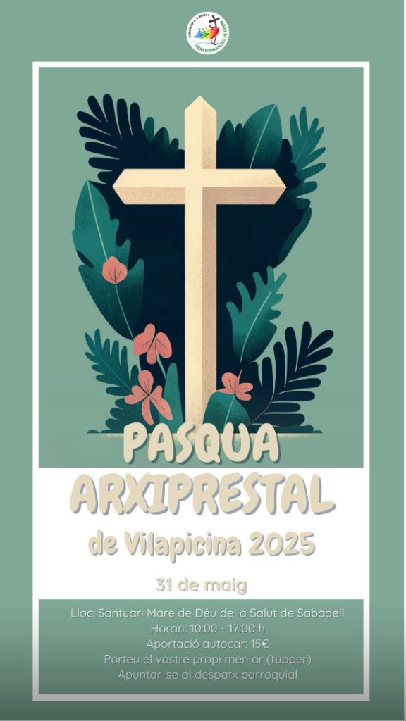 La Trobada Pasqual Arxiprestal d’enguany, es celebrarà el dissabte dia 31 de maig al Santuari de la Mare de Déu de la Salut (Ctra. de Caldes C-1413. Km. 24 · Sabadell). La durada de la trobada serà aproximadament de 10.00h. del matí a les 17.00h. de la tarda. El preu de la sortida és de 15 euros, i cada persona s’ha d’emportar el dinar (tupper). Recordin que, per poder anar-hi, caldrà fer la inscripció prèvia en el despatx parroquial en horari de dilluns i dimecres de 18.00 a 20.00 h.