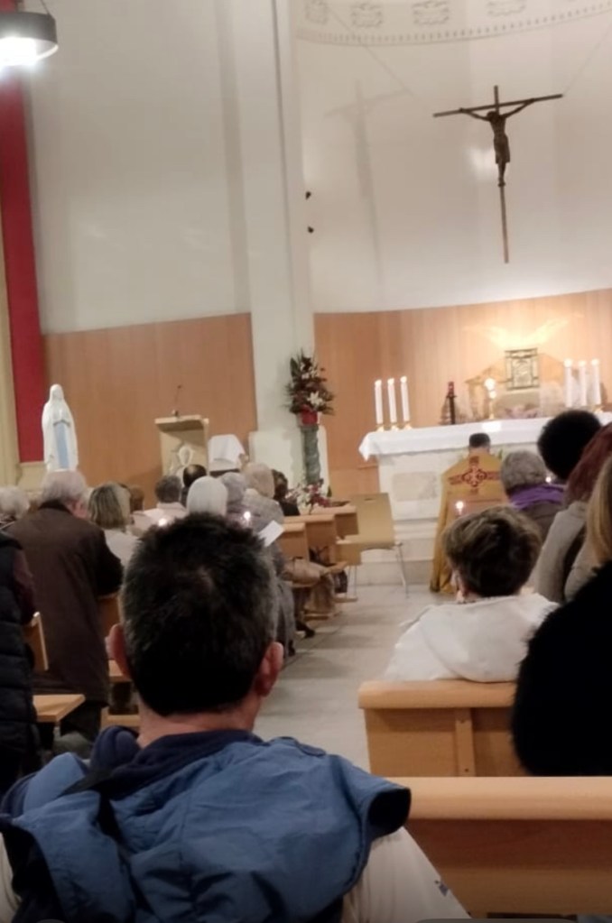 La adoración al Santísimo Sacramento comenzó con el canto del Pange Lingua, que acompaña la exposición solemne del Señor. A continuación se rezó el Santo Rosario, oración que es también un camino privilegiado para acercarnos a Cristo de la mano de María. Tras el rezo de cada Misterio de Gloria, el sacerdote y los fieles que lo acompañaron, entonaron el Himno de la Virgen de Lourdes, mientras elevaban sus candelas, un gesto sencillo y luminoso de devoción y de unidad.